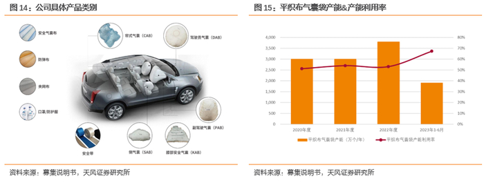 产能、产能利用率方面:2022年公司平织布气囊袋产能增幅较大,2023年以来公司平织布气囊袋产能利用率较为充分。