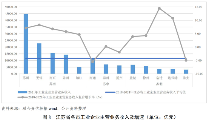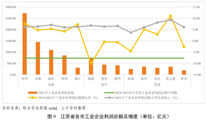 在各项促进工业经济增长的政策措施带动以及人才、技术的集聚之下,江苏省工业经济保持了较好的发展势头,工业企业效益不断提高。本文选取了工业企业营业收入、利润总额和利润总额/营业收入三个指标来反映江苏省工业企业的效益状况。从主营业务收入来看,除镇江市外,苏南地区远高于苏中和苏北地区,也高于江苏省工业企业主营业务收入的平均值,作为省内发展引擎的苏南地区,因其良好的产业基础,在工业企业经营规模上具有压倒性优势;苏中、苏北地区则均低于省内平均值。而主营业务收入增速(2018-2021)方面,除镇江市的增速低于5.00%以外,其余苏南四市均超过5.00%,保持较高增速;苏中三个城市,泰州市增速仅为0.23%,南通和扬州两市的增速均为负;苏北五市中,除淮安市增速为负外,其余四市均为正。值得一提的是,宿迁和连云港两市的增速均在10.00%以上,领先苏南地区。从利润总额来看,除镇江市外,苏南地区也远高于苏中和苏北地区,苏中地区次之,苏北地区最末,苏北地区的连云港市增速突出,高达11.08%。从利润总额/营业收入来看,苏南和苏中地区大都集中在6.00~7.00%,而苏北地区则跨度较大,其中盐城仅为3.65%,系全省最低,徐州和淮安分别为6.01%和6.10%,与苏南、苏中地区水平相当,而宿迁和连云港则分别高达8.11%和9.35%。可见,虽然苏南地区在工业企业效益方面整体领先于苏中和苏北地区,但苏北地区的部分城市也在利用其后发优势缩小与苏南地区的差异。