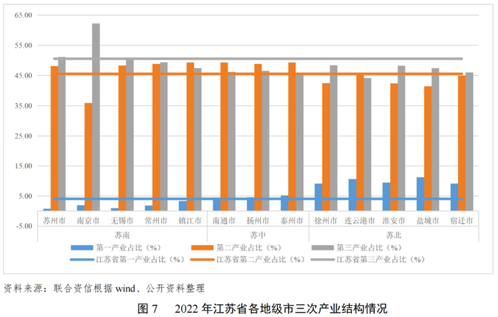 从产业结构看,江苏省下辖13个地级市产业结构各有侧重,具有较为明显的层次性。苏南地区产业格局更优,整体呈现“三二一”的产业结构,苏中地区产业格局以“二三一”为主,苏北地区产业结构较为传统,系省内第一产业占比最高区域。产业结构是经济结构的重要组成,产业结构的优化升级可以促进区域内经济增长。从2022年江苏省各地级市三次产业结构来看,江苏省下辖13个地级市产业结构具有较为明显的层次性。苏南地区产业结构主要呈现“三二一”的格局,第三产业平均水平(52.2%)领先于全省第三产业占比(50.5%),产业引领作用凸显。其中,南京市第三产业占比最高,已达62.2%;苏州市和无锡市第三产业比重均超过50.0%。苏中地区产业格局以“二三一”为主,第二产业系其增长主要动力,平均水平(49.2%)高于全省第二产业占比(45.5%),第三产业平均水平不及全省值。苏北地区系省内第一产业占比最高区域,第一产业平均水平(9.88%)远高于全省第一产业占比(4.0%),第二产业平均水平(43.30%)及第三产业平均水平(46.82%)均低于全省值。上述产业结构反映出苏南地区随着经济的继续向前发展以及位于“长三角经济区”中心区域的区位优势等因素影响,长期以来的产业结构调整成效已十分显著;苏中地区由于其传统工业产业起步较早,第三产业发展相对滞后,仍需进行产业结构的持续优化升级;苏北地区工业、服务业等相对苏南地区仍不发达,仍需加快促进产业链高级化。