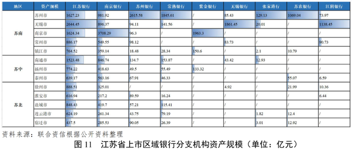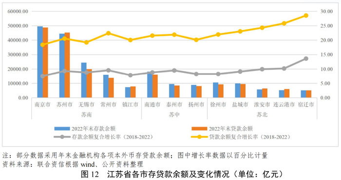 江苏省整体金融资源较为丰富,其中苏南地区在金融机构分支机构及资产余额方面均远大于苏中和苏北地区,省内金融机构存贷款余额呈现“苏南>苏中>苏北”态势,但增速或受基数影响而呈现相反趋势,亦反映出近年来相对欠发达的苏北、苏中地区同苏南地区差异或在缩小。资金是企业经济活动的第一推动力和持续推动力,较大力度的资金支持,可使企业的发展更加顺利。而属地金融机构的数量可以在一定程度反映当地的金融资源丰富程度。截至2022年末,全国共有27家区域性银行在A股上市,其中江苏省有9家(3家城商行和6家农商行)。从总部分布看,江苏银行系江苏省内唯一一家省级区域行,剩余8家有2家位于南京,4家位于苏州,2家位于无锡。从分支机构家数来看,同9家银行的属地一致,其分支机构亦明显更多集中在苏南地区,在苏南、苏中、苏北地区的分支机构分别为1050家、165家和221家。从分支机构的资产规模来看,上述9家金融机构在苏南、苏中、苏北地区各分支机构的资产规模分别为2.57万亿、0.55万亿和0.55万亿。可见,苏南的金融资源明显较苏中、苏北地区更加丰富。