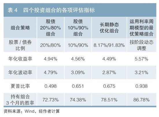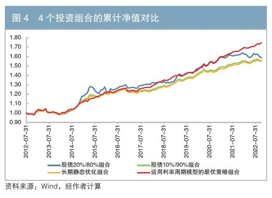 图4表明从长期来看,运用利率周期模型的最优策略组合的收益率优于其他3个组合。表4说明运用利率周期模型的最优策略组合的年化收益率、夏普比率和持有组合3个月的胜率(收益为正的概率)皆优于其他3个组合。其中,最优策略组合在2015年上半年的表现明显落后于其他组合,原因是在此阶段股市显著上涨,最优策略组合的股票配置比例较低。但随着股市牛熊转换,在2015年下半年债券利率周期步入阶段Ⅳ,股票高配置组合经历了较大程度的净值回撤和净值波动,最优策略组合因全部配置债券资产没有受到股市冲击。在2022年,最优策略组合同样因全部配置债券资产而有效规避了股市的大幅调整,展示出策略的优越性。