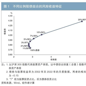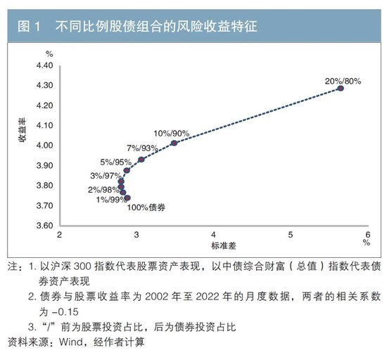 根据马科维茨的投资组合理论,通过调整投资组合中不同类别资产的比例,可以使投资组合在一定条件下达到理论上的最优状态,即风险既定情况下的收益最大化,或是收益既定情况下的风险最小化。“固收+”产品的核心策略就是利用分散化优化投资组合的风险收益特征。只要加入投资组合的资产收益与债券收益不完全相关,且期望收益高于债券,就可以在长期内降低投资组合的波动率,提高投资组合的期望收益。我国股市和债市近20年的历史数据显示,在100%债券的投资组合中加入特定比例的股票资产,可以在降低投资组合风险的情况下,提高投资组合的收益(见图1)。