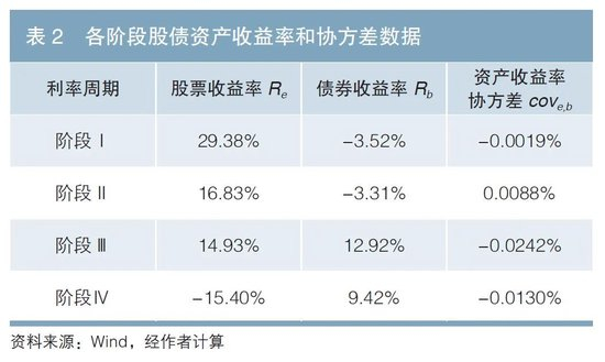 根据上述利率周期四阶段的划分,笔者以沪深300指数代表股票资产表现,以中债综合财富(总值)指数代表债券资产表现,统计在利率周期的四个阶段各类资产的期望收益率以及彼此之间的相关程度。在统计过程中,笔者将每个利率周期中同一阶段的数据按时间序列排序,统计结果如表2所示。除阶段Ⅱ股债资产收益表现呈弱正相关外,其余各阶段股债资产皆呈现负相关性。