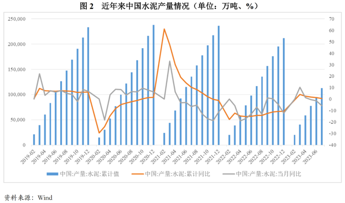 供给方面,从产能来看,根据百年建筑网数据,2023年上半年全国新投产水泥熟料产线13条,主要分布在广西、贵州、宁夏、山东、湖南、湖北、江苏、吉林地区,熟料产能合计1878万吨,规模较小。从产量来看,2023年1-7月,全国水泥产量11.27亿吨,同比增长0.60%。其中一季度因春节假期提前、不利天气影响较小及上年基数较低等因素,累计产量同比增长4.1%;二季度因新开工项目减少、北方高温、南方雨水及6月进入淡季等不利因素,单月产量同比增速转负。