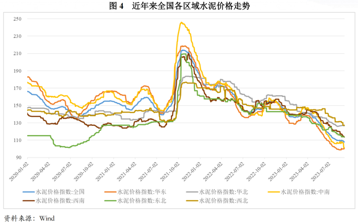2023年1-8月,全国水泥价格整体处于下行态势,各区域之间水泥价格差距加大,其中西北、华北、东北区域价格韧性较强,下降幅度相对较小;中南区域价格波动幅度较大,价格已低于全国均价;华东区域价格较低,但与全国均价之间的差距波动提升;西南区域价格跟随大市。从月度走势来看,1月全国水泥价格延续2022年底的回落走势继续下探,2-3月企稳回升,4-8月加速下行。