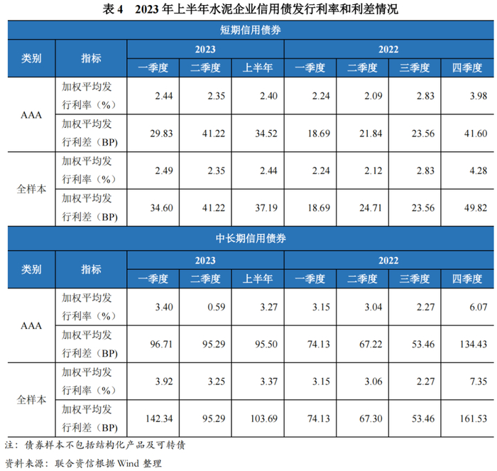 从发行成本看,2023年上半年,市场流动性先紧后松,资金利率先上后下,10年期国债到期收益率自2023年3月以来大幅下行。由于水泥行业发债主体主要为高信用等级的央企和地方国企,行业发行利差保持在较低水平。具体来看,受2022年底银行理财赎回潮冲击以及春节后理财赎回的缓解影响,2023年1季度,信用债整体利差在大幅走阔后回落,2023年3月后,由宏观经济整体偏弱带来的资金宽松叠加“资产荒”,进一步推动信用利差收窄;从水泥企业发行利差看,水泥企业新发行的长短期债券利差基本延续了2022年4季度情况,但利差有所收窄;2季度以来,由于下游需求不足,水泥企业1季报业绩普遍下滑甚至亏损,新发行的短期债券利差走阔,但长期债券利差有所收窄。