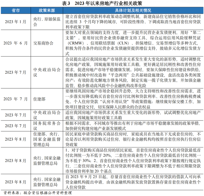 2023年以来,房地产行业政策延续宽松的基调,上半年调控政策以有效防范化解房企风险,促进房地产行业平稳发展及保交楼为主;进入下半年以来,“认房不认贷”、首付比例降低、二套利率下调等利好政策密集出台,上述政策对房地产市场信心提振带来正面激励作用,有助于改善购房者预期,有效促进房地产企业去库存,进而促进房企现金回流,亦对流动性紧张房企的资金压力起到一定的缓解作用。但考虑到当前市场信心仍不足,最终的改善程度仍需关注政策的持续性及政策的具体释放效果。