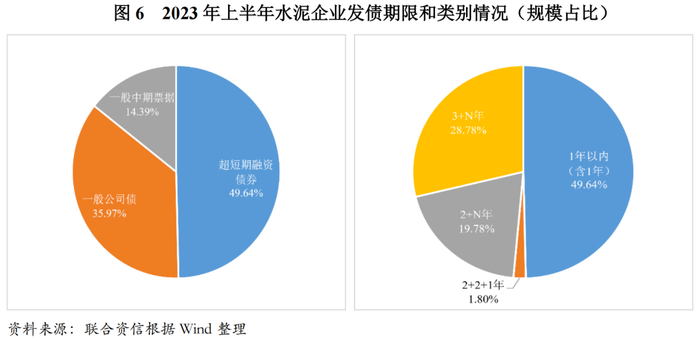 从发债期限看,水泥企业发行债券期限偏短,2023年上半年发行的20只债券中有11只债券在1年以内(含),发行规模占49.64%(2022年同期为59.49%),均为银行间超短期融资券产品。