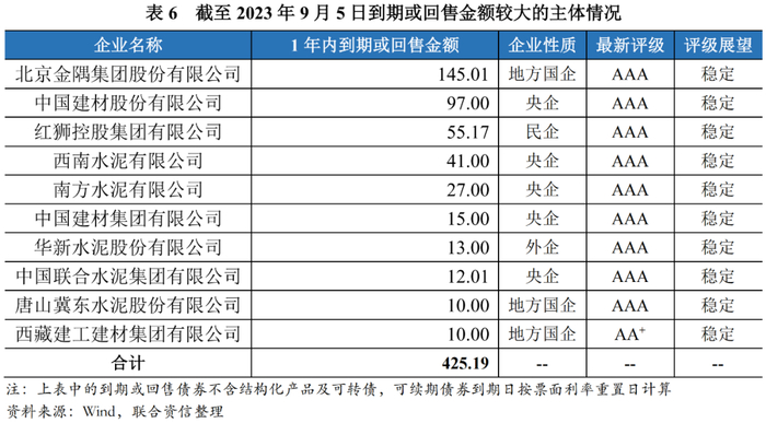 截至2023年9月5日,样本水泥企业1年内到期的到期或回售的债券规模尚可,以AAA信用等级企业为主,兑付风险小。