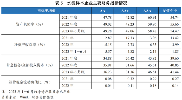 截至2023年9月5日,水泥企业尚有存续债的企业共16家,信用等级以AAA为主,合计10家;AA+合计4家,AA仅2家,基本为全国或区域内的主导水泥企业。从财务指标来看,2021年以来,受煤炭价格等大宗商品价格上涨影响,水泥企业经营成本大幅增加,盈利能力承压,债务负担有所增长,尤其是2022年受生产成本增长叠加下游需求不足,水泥企业净资产收益率较2021年进一步下行,部分区域水泥企业出现亏损。