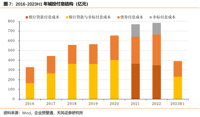 从整体来看,付息压力主要来自银行贷款,2022年占比达到了44.7%,这是由银行贷款的融资规模决定的。其次是债券,2022年占比40.2%,其付息成本的绝对规模逐年增加,占比也逐渐增大。非标由于融资规模较小,付息压力不大。