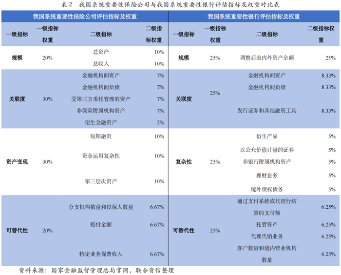 相似处方面,二者评估指标的设定均从我国金融业发展实际出发,同时借鉴国际经验,与系统重要性定义中的特征保持一致,重点衡量金融机构规模、结构和业务复杂度、与其他金融机构关联性以及在金融体系中提供难以替代的关键服务,并以此计算出参评机构系统重要性得分,形成系统重要性保险公司或银行初始名单。具体指标来看,两者均为4个一级指标且指标存在较高的相似度,均采用了“规模”“关联度”“可替代性”指标,与“大而不能倒”“太关联而不能倒”的原则保持一致,同时,“资产变现”体现了险企流动性水平及资金运用复杂性等方面,与《银行评估办法》中“复杂性”指标含义存在一定的重合。
