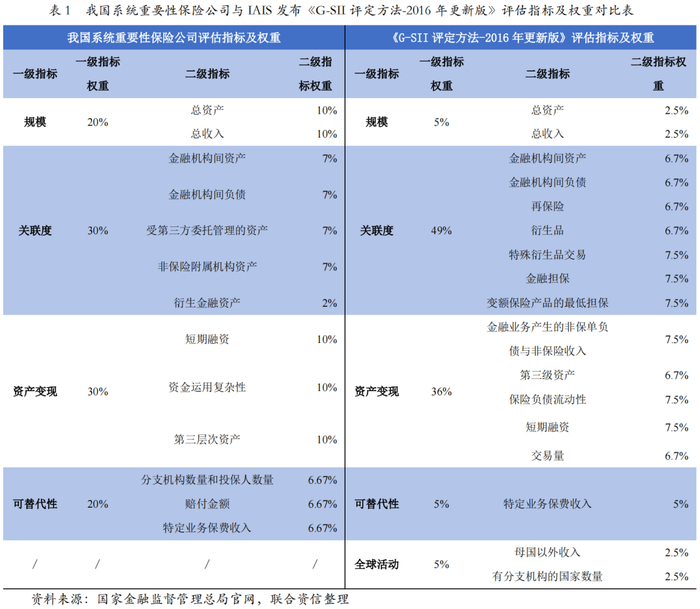 《办法》是《G-SII评定方法》在国内的探索,在指标选取等方面存在一定相似性,但《办法》结合我国金融环境实际情况,与《G-SII评定方法》亦存在差异,主要有:1、指标分类不完全相同,《G-SII评定方法》含5类一级指标,而《办法》评估指标包括四个方面,未单列“全球活动”指标,一定程度上说明我国系统重要性保险公司其产生的系统性风险主要在国内;2、《办法》加大了“规模”及“可替代性”一级指标的权重,这方面更接近于对国内系统重要性银行的评估标准;3、“关联度”“资产变现”及“可替代性”二级指标构成不完全相同,这与我国保险业行业格局、经营特征及监管体制等因素相关(见表1)。