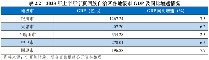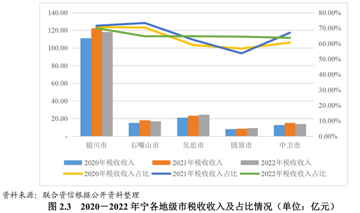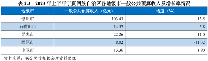 宁夏各地级市中银川市和石嘴山市工业实力相对较强,吴忠市、中卫市、固原市的畜牧业和食品加工业实力相对较强。2022年,宁夏各地市经济总量维持增长,其中固原市经济增速位居宁夏各地市首位,规模上银川市仍处于绝对领先地位。2022年,宁夏各地级市一般公共预算收入维持增长(剔除增值税留抵退税因素影响),其中吴忠市增速位居宁夏各地市首位,宁夏各地级市税收收入占一般公共预算收入比重整体偏低,且财政对上级补助依赖程度高。2020-2022年,宁夏各地市政府债务余额均呈持续上升趋势,其中银川市政府债务率较高,2022年银川市上级补助收入增幅较大,政府债务率有所下降但维持较高水平。2023年上半年,宁夏各地级市经济总量较同期维持增长,除固原市受到缓征税款影响,一般公共预算收入同比下降外,其余地级市一般公共预算收入同比有所增长。