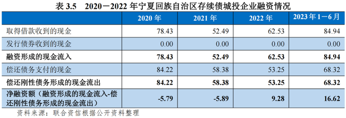 从宁夏存续债城投企业对外融资情况来看,考虑到政府注资、往来拆借等行为可能对城投企业融资活动现金流入及流出产生扰动影响,本报告用“取得借款收到的现金+发行债券收到的现金”来表示城投企业从金融机构及债券市场进行融资形成的现金流入,用“偿还债务支付的现金”来表示城投企业偿还刚性债务形成的现金流出,更为直观地反映城投企业自身融资能力以及金融机构及债券市场对城投企业的认可度。2020-2022年,宁夏存续债城投企业融资形成的现金流入波动下降,年均复合下降10.71%。同期,宁夏存续债城投企业偿还刚性债务形成的现金流出持续下降,年均复合下降20.49%。2020-2021年,宁夏存续债城投企业净融资额持续净流出,2022年,宁夏存续债城投企业净融资额转为净流入。2023年上半年,宁夏存续债城投企业净融资额仍呈现净流入状态,且较2022年整年有较大幅度增加。