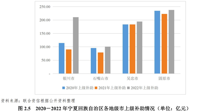 [5]上级补助收入=返还性收入+一般性转移支付收入+专项转移支付收入+政府性基金收入上级补助;联合资信未在官方途径查询到中卫市全市上级补助相关数据,故此处上级补助分析仅涉及银川市、石嘴山市、吴忠市和固原市;吴忠市全市上级补助数据出自2020-2022年财政预算执行情况。