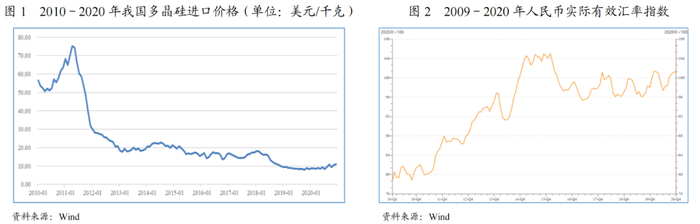 2010-2011年,我国光伏组件出货量最多的企业主要包含无锡尚德太阳能电力有限公司(以下简称“无锡尚德”)、英利绿色能源控股有限公司(以下简称“英利绿色能源”)、晶澳太阳能科技股份有限公司(以下简称“晶澳科技”)和天合光能股份有限公司(以下简称“天合光能”)等。2011年,美国商务部对我国光伏制造企业实施“双反”调查,其中英利绿色能源、无锡尚德和天合光能分别被征收31.18%、31.22%和31.14%的反倾销税,其他未应诉中国光伏企业的税率为249.96%,我国光伏产品出口成本大幅增加。同时,因我国光伏产业“两头”在外,原材料多晶硅过度依赖进口,在“双反”调查背景下,中欧、中美贸易摩擦加剧,国外多晶硅生产商被下游客户签订大量长协合同,流入现货市场的多晶硅较少,现货价格被迅速推高,使得我国多晶硅进口价格大幅上涨至2011年4月75.12美元/千克的最高点,光伏产品生产成本骤增。与此同时,人民币在该时期已处于升值通道,进一步降低了国内光伏产品出口的竞争力。2012年,我国光伏组件产量约24GW,其中出口占比同比下降11.31个百分点。