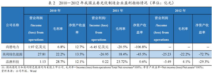 受“双反”调查影响,我国光伏制造企业整体盈利能力明显减弱,部分企业甚至被迫破产重组。2011年,尚德电力和英利绿色能源营业利润分别为亏损6.45亿美元和26.95亿元;各项盈利指标均显著恶化。2012年,英利绿色能源仍处于大幅亏损状态;晶澳科技毛利率和净资产收益率分别同比大幅下降19.62个百分点和36.10个百分点;而尚德电力因资不抵债于2013年3月破产重整。随着盈利和偿债能力明显减弱,企业融资亦受到严重影响,金融机构收紧对光伏制造企业贷款政策,再融资空间不断收窄,进一步加大了光伏制造企业流动性压力。