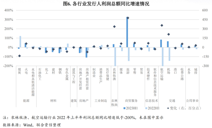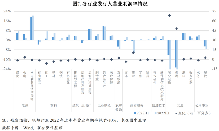 从各行业信用风险表现来看,2023年上半年同比出现较大变化的行业有:受大宗商品价格跌多涨少以及需求不足的影响,煤炭、石油化工、化工行业财务表现同比明显变弱,其中煤炭和石油化工行业景气度虽然出现下降拐点,但整体仍处近五年同期高位;因出行限制取消及消费逐步恢复,航空运输、机场以及旅游等服务类行业同比快速修复,但部分指标仍处负值区间,盈利和杠杆水平的回归仍需时日。