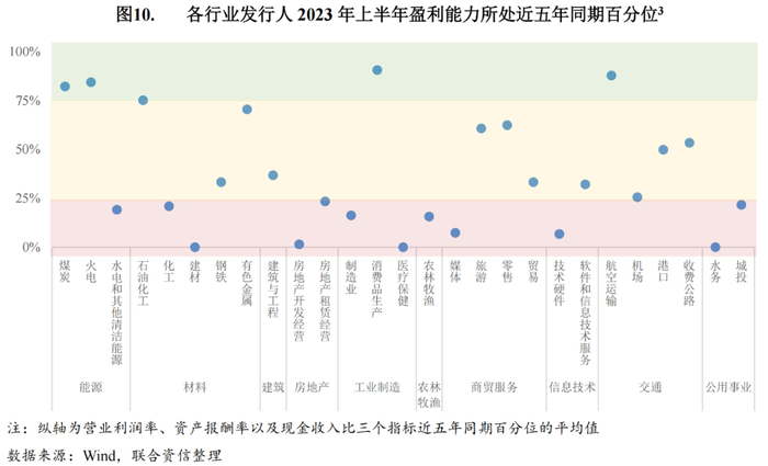 近五年同期比较来看,2023年上半年火电、石油化工、消费品生产、机场以及收费公路盈利能力达到近五年同期较好的水平;而建材、房地产开发、医疗保健、媒体以及水务行业盈利能力处于近五年同期低位。