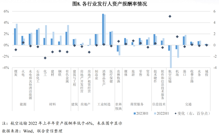资产报酬率方面,2023年上半年,房地产租赁、农林牧渔、航空运输和机场四个行业资产报酬率为负值。资产报酬率同比下滑的行业集中在材料、建筑以及房地产等行业,其中化工行业资产报酬率下滑幅度最大,房地产租赁行业资产报酬率由上年同期的正值转为负值;农林牧渔、航空运输和机场行业资产报酬率较上年同期有所改善,但仍未转正;旅游行业资产报酬率明显回升转为正值;得益于燃料价格回落,火电行业资产报酬率得到修复。