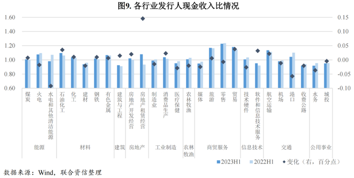 现金收入比方面,2023年上半年,27个行业中有16个行业现金收入比大于1,其中房地产租赁行业现金收入比同比明显上升,回款效率显著提升;港口行业现金收入比同比虽然出现明显下降,但收现比仍处于较高水平,盈利质量尚可;建筑与工程行业现金收入比低位运行,行业收入实现难度较大。现金收入比小于1的行业中,水电和其他清洁能源行业收现比同比下降幅度较大,经营获现能力值得关注。