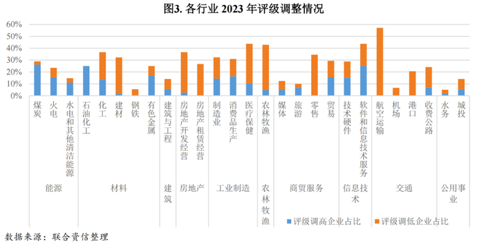 从各行业企业的“3C”评级结果来看,2023年煤炭、石油化工行业内四分之一左右的企业评级结果调高,行业整体信用质量提升;火电行业信用状况得到一定修复;建材、房地产、农林牧渔、零售行业评级结果均值连续两年下降且降幅扩大,行业信用状况持续恶化;医疗保健、航空运输行业评级结果均值由2022年的小幅提升转为2023年的明显下降,且级别调降比例超过三成,行业整体信用风险值得关注;水务、钢铁以及机场行业评级结果不变的企业占比超过90%,整体信用质量相对稳定;软件和信息技术服务行业内级别调高与调低的企业均较多,行业内主体信用质量呈分化态势。