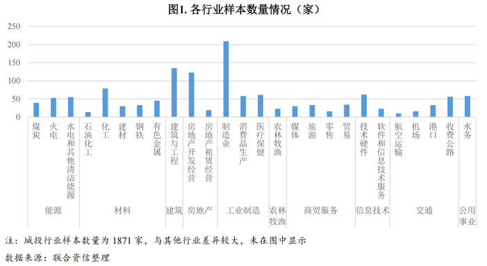 行业分类方面,本文按照联合资信行业分类(2022版),选取样本数量大于10且披露数据质量较好的27个行业,其中城市基础设施投资(以下简称“城投”)行业样本数量最多(1871家),其次为制造业(209家),建筑与工程和房地产开发经营行业样本数量在100~200家之间,多数行业企业样本数量不到100家,航空运输行业样本数量最少,仅为10家。