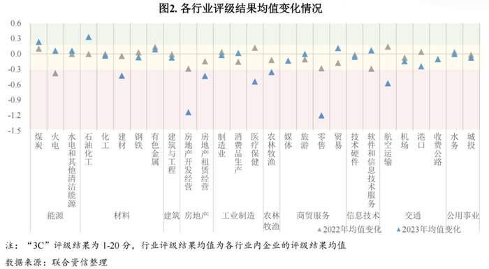 本部分先从各行业企业的“3C”评级结果的均值变化、行业内级别调整的企业占比两个角度,来回顾观察2023年各行业整体信用状况的变化情况。