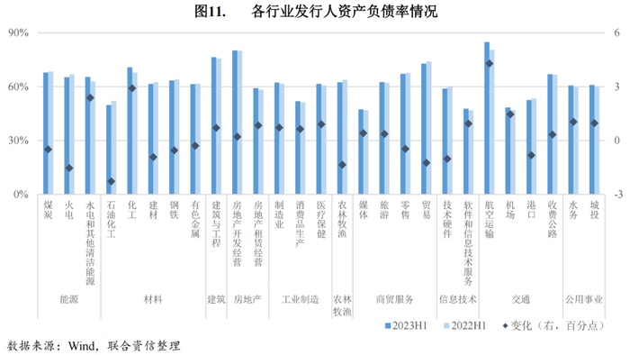近五年同期比较来看,2023年上半年煤炭、石油化工、有色金属、技术硬件行业杠杆水平处于近五年同期低位;水电和其他清洁能源、化工、旅游、软件和信息技术服务、航空运输、机场、收费公路、水务以及城投行业杠杆水平达到近五年同期较高的水平。