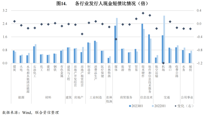 短期偿债能力指标方面,2023年上半年,27个行业中有7个行业现金类资产能够覆盖短期债务,其中制造业、消费品生产以及两个信息技术行业现金短债比同比进一步上升,短期偿债压力较小;机场、媒体行业短期债务占比明显上升,现金短债比同比虽然出现明显下降,但现金短债比仍处于较高水平,短期偿债能力相对较强。现金类资产无法覆盖短期债务的行业中,农林牧渔、航空运输行业现金短债比在本就较低的水平上进一步下降,短期偿债压力较大;火电、水电和其他清洁能源行业现金短债比下降至低于0.50倍的水平,短期偿债压力提升。