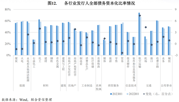 剔除商业信用等无息负债后,从全部债务资本化比率来看,2023年上半年,27个行业中有19个行业全部债务资本化比率同比均有所上升,其中航空运输、机场、化工、房地产租赁经营行业全部债务资本化比率同比上升幅度较大;8个全部债务资本化比率同比下降的行业中,贸易、煤炭、火电行业同比下降幅度较大。