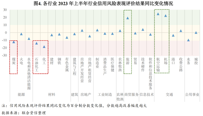 从各行业的信用风险表现评价结果[2]的同比变化来看,2023年上半年同比出现较大变化的行业有:受大宗商品价格跌多涨少以及需求不足的影响,煤炭、石油化工、化工行业同比下行幅度较大;因消费及出行限制取消,航空运输、机场以及旅游等消费服务类行业同比快速修复。