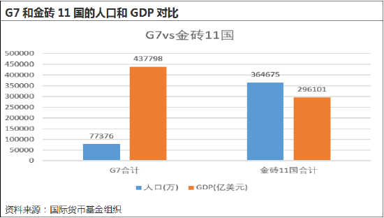 根据IMF2022年的数据,金砖国家组织扩容后11国人口占到了全球的46.1%,接近一半,GDP总量占到了30%,这个全球最有影响力的南方国家组织,在全球事务中更加举足轻重。相比,G7人口不到10%,但GDP总量依然占全球的44%,大于金砖国家。从发展的趋势上看,金砖11国的经济总量超过G7只是时间的问题。