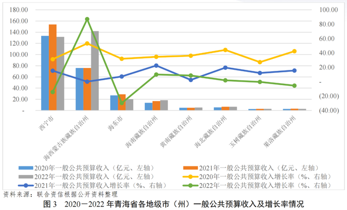 从一般公共预算收入看,青海省各州市一般公共预算收入规模差距较大,2022年西宁市和海西州一般公共预算收入高于百亿,分别为131.72亿元和141.91亿元,其他州市一般公共预算收入总和为56.36亿元;南部地区一般公共预算收入规模普遍较低,仅海南州超过10.00亿元,其他三个州均不足7.00亿元,青海省各州市财政实力呈“北强南弱”的格局。从一般公共预算收入增速来看,2022年海西州一般公共预算收入大幅增长87.00%,主要原因为随盐湖资源的不断开发,海西州2022年围绕盐湖化工业有多家企业落地,多个大型项目开工建设,工业总产值由2021年的852.28亿元大幅增长至1313.00亿元,规上工业企业利润总额551.33亿元,同比增长3.4倍;黄南州和海北州增速在10.00%以下;西宁市、海东市、玉树州和果洛州一般公共预算收入增速均为负。