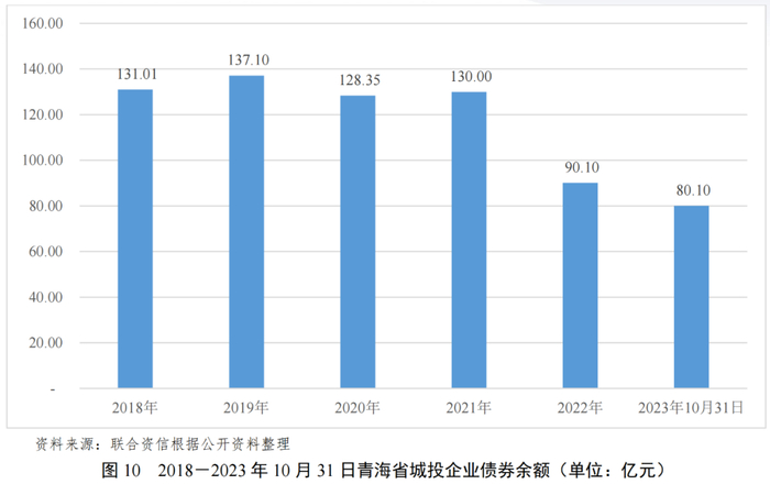 2017年以来,青海省发债城投企业数量有所下降,城投企业存续债券余额波动下降,截至2023年10月31日,青海省有存续债券的城投企业共2家,存续债券余额合计80.10亿元,有存续债券的城投企业均在西宁市,其中,西宁城市投资管理有限公司(以下简称“西宁城投”)存续债券余额62.00亿元,西宁经济技术开发区投资控股集团有限公司(以下简称“西宁经开”)存续债券余额18.10亿元。总体看,青海省发债城投企业少,均集中在西宁市。