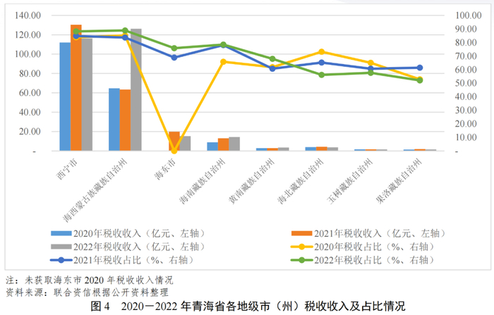 从地市层面看,青海省各州市经济发展水平分化大,发展相对不均衡,头部集聚效应明显,西宁市作为省会城市和全省经济中心,GDP规模远超其他州市,占青海省全省GDP的45.55%。除海西州外,2022年青海省各州市GDP增速均低于全国增速。青海省各州市财政实力呈“北强南弱”格局,整体分化明显。2020-2022年,西宁市和海西州一般公共预算收入稳定性较强,其余各州市一般公共预算收入稳定性尚可,青海省各州市财政自给能力弱。青海省各州市政府债务余额呈快速上升趋势,西宁市、海东市和海西州政府债务规模及债务率显著高于其他地区,其他各州债务余额均较小。