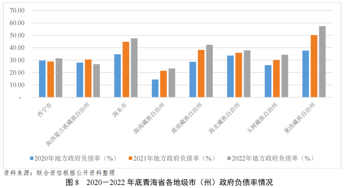 截至2022年底,海南州、海北州、玉树州和果洛州政府债务率均为40.00%以下,黄南州政府债务率为43.30%,偿债能力较强;海西州政府债务率为88.13%,同比下降21.51个百分点,偿债能力一般;从增速来看,西宁市和海东市政府债务率同比分别增长9.10个百分点和9.83个百分点,增速位于青海省前两名。