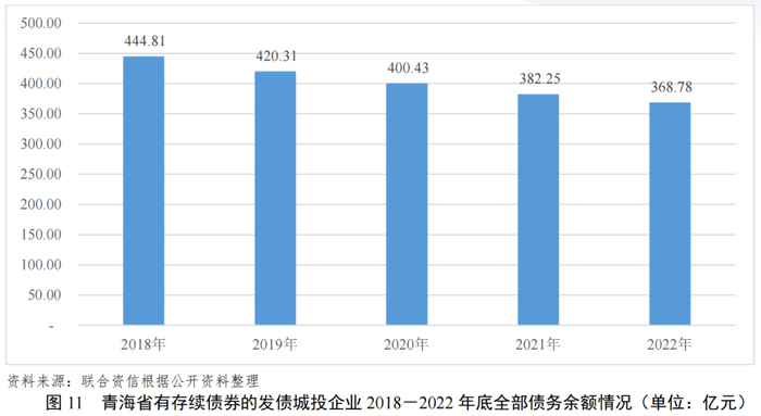2020年,青海省省属国有企业相继出现信用风险事件,青海省企业融资环境和再融资能力受到一定负面影响。同时,随着部分城投企业债务到期兑付,2018-2022年,青海省发债城投企业全部债务余额逐年下降,截至2022年底为368.78亿元,全部集中在西宁市。
