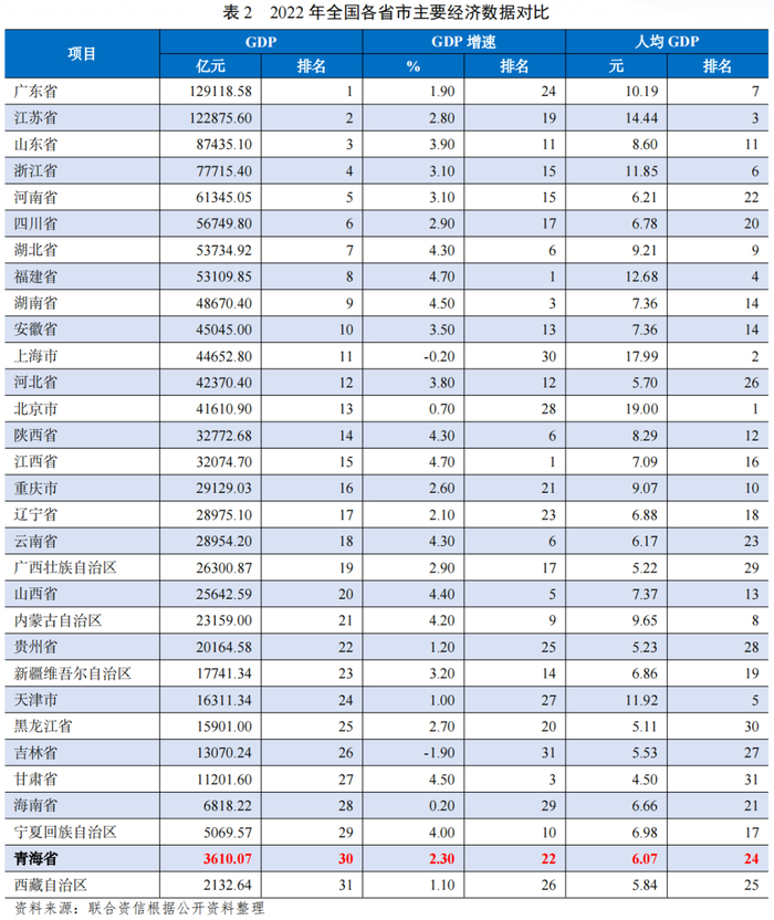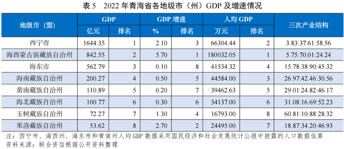 从人均GDP看,2022年,海西州和西宁市人均GDP分别为18.00万元和6.63万元,位列全省前二。其他州市人均GDP均未超过4.50万元,最高为海南州(4.46万元)。