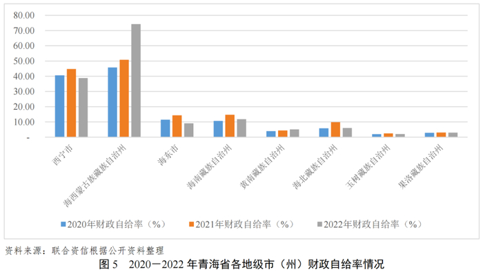 财政自给率方面,2020-2022年西宁市和海西州财政自给率超过30.00%,2022年分别为38.85%和74.24%,海西州财政自给率上升幅度较大;其他州市2020-2022年财政自给率均未超过15.00%。总体看,青海省各州市财政自给能力弱,对上级补助收入的依赖性强。