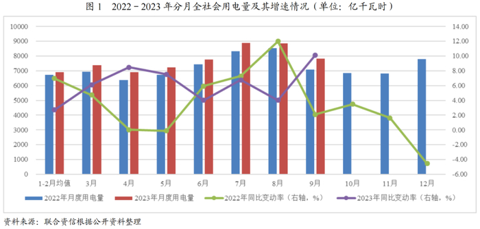 2023年前三季度,第一产业用电量976亿千瓦时,同比增长11.3%,主要由于近年来国家深入推进乡村振兴战略以及乡村用电条件改善、电气化水平持续提升,带动第一产业用电潜力持续释放。2023年前三季度,第二产业用电量4.47万亿千瓦时,约占总用电量的65%,同比增长5.5%。其中,部分高技术及装备制造业用电量增幅明显,如新能源车整车制造电量同比增长39.3%,反映出当前制造业升级态势明显,新动能成长壮大。2023年前三季度,第三产业用电量1.25万亿千瓦时,同比增长10.1%,主要系第三产业上年同期受公共卫生事件冲击显著以及电动汽车高速发展拉动充换电服务业用电量大幅增长所致。同期,城乡居民生活用电量1.04万亿千瓦时,同比小幅增长。