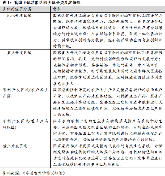 从主体功能区划分战略启动的时间轴来看,主体功能区规划战略提出的时间可以追溯到2010年国务院的第一个全国性国土空间开发规划《全国主体功能区规划》(下称《规划》),《规划》要求各地各部门尽快组织完成省级主体功能区规划编制工作,调整完善财政、投资、产业、土地、农业、人口、环境等相关规划和政策法规,建立健全绩效考核评价体系,全面做好《规划》实施的各项工作。《规划》包括规划背景、指导思想与规划目标、国家层面主体功能区、能源与资源、保障措施、规划实施等6篇,共13章。《规划》还收录国家重点生态功能区名录、国家禁止开发区域名录和20幅图等3个附件,全文7万多字。《规划》的一个值得重点关注的地方是依照开发方式将国土空间划分为优化开发区域、重点开发区域、限制开发区域和禁止开发区域。