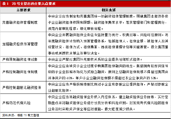 根据75号文,对于中央企业而言,融资担保主要包括中央企业为纳入合并范围内的子企业和未纳入合并范围的参股企业借款和发行债券、基金产品、信托产品、资产管理计划等融资行为提供的各种形式担保,也包括出具有担保效力的共同借款合同、差额补足承诺、安慰承诺等支持性函件的隐性担保。75号文就加强中央企业融资担保管理工作主要提出以下六点要求: