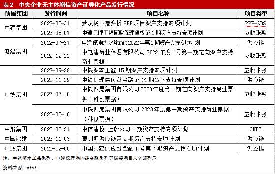 随着75号文的出台,中央企业开始逐步缩减对资产支持证券的融资担保规模,探索无主体增信资产证券化产品模式,依托基础资产质量发行资产证券化产品。自2022年3月起,中国建设集团有限公司、中国电力建设集团有限公司、中国铁路工程集团有限公司等中央企业逐步开始发行无主体增信资产证券化产品。截至2023年11月末,市场累计发行约20余单央企无主体增信资产证券化产品,基础资产类型包括PPP、供应链金融、应收账款和CMBS。