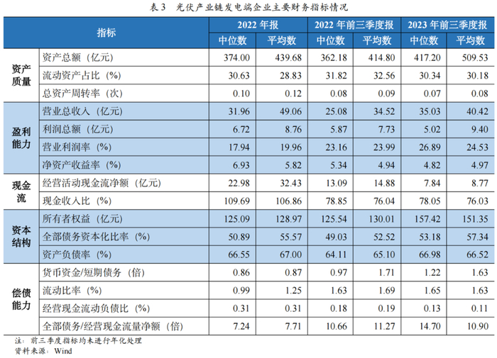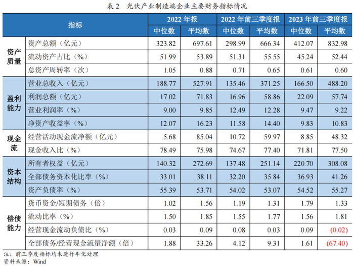 从财务指标来看,2023年前三季度,光伏产业制造端企业资产规模保持增长趋势,流动资产占比保持相对稳定。受经营规模扩大因素带动,光伏产业制造端企业营业收入同比有所增长,但由于上游原材料价格上涨,营业利润率同比有所下降,光伏产业制造端企业经营活动现金流净流入规模同比大幅下降,现金收入比仍处于较低水平;债务负担有所加重,偿债能力指标波动较大。
