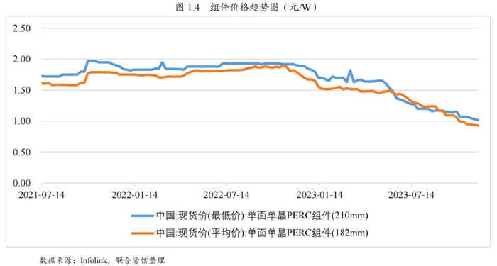 价格方面,2023年以来,组件价格呈快速下降趋势。截至2023年11月22日,单面单晶PERC组件(210mm)和PERC组件(182mm)价格已分别降至1.02元/W和0.93元/W,且仍未出现止跌迹象。其中,“一体化”企业凭借自身成本优势和较强的抗风险能力获取微利;但考虑到“非一体化”企业制造成本更高[2],而目前低廉的组件价格已对中小规模企业及“非一体化”企业形成巨大经营压力,光伏行业迈入“洗牌”阶段,大量电池片、组件产能规模或将加速出清。