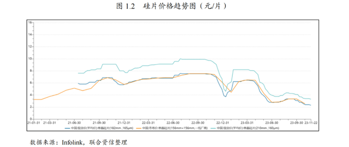 价格方面,硅片作为多晶硅直接下游产业,其价格变动主要受上游成本传导影响。2022年以来,硅片价格趋势与多晶硅基本保持一致。进入2023年,硅片价格持续走低。考虑到硅片环节供大于求及多晶硅价格低位态势短期内难以扭转的局面,预计2024年上半年硅片价格仍将保持低位运行。