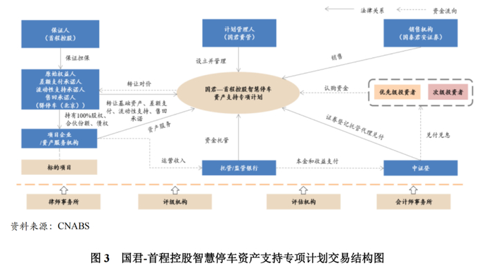 与其他类REITs相比,停车场类REITs产品底层资产由于停车场资产的特性通常较为分散,一个产品中会涉及多个项目公司以及多个标的债权。以“国君-首程控股智慧停车资产支持专项计划”为例,该项目交易结构图如下。