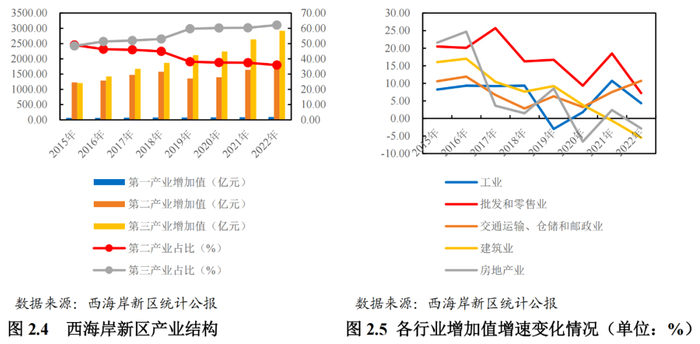 工业稳居首位,但产业结构由以工业为主逐渐向批发零售业转移。西海岸新区加快新旧动能转换,产业结构持续优化,产业结构从2015年的2.47:49.08:48.45调整至2022年的1.97:35.89:62.14,第三产业占比明显提升。从各行业增加值来看,工业增加值规模保持首位,但增速下降明显,批发和零售业增加值上升较大。